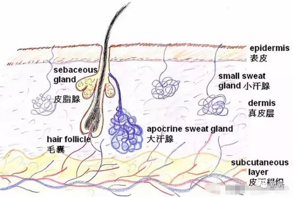 羊在网上找到一张非常良心的手绘图,大家来直观感受一下哈。大汗腺的线体是由立方形腺体细胞组成的,就是这样一大坨的样子,通常和毛囊共用一个出口;而小汗腺嘞,是单层椎体细胞,看起来比较瘦小,有自己单独的皮肤小出口。
