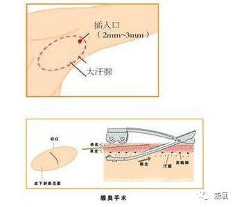 微创皮下除腋臭术:将皮下大汗腺随同脂肪组织一并清除。在腋窝开一个1厘米的小切口,用抽吸管进行皮下浅层抽吸,将汗腺组织彻底破坏和吸出,抑制腋汗分泌。