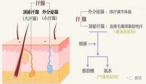大汗腺与生俱来,青春发育期开始逐渐具备分泌功能。有些人分泌功能比较旺盛,分泌的弱碱性物质和脂质类以及分泌浓稠液含铁多,再经细菌分解,就会散发出酸腐的气味。