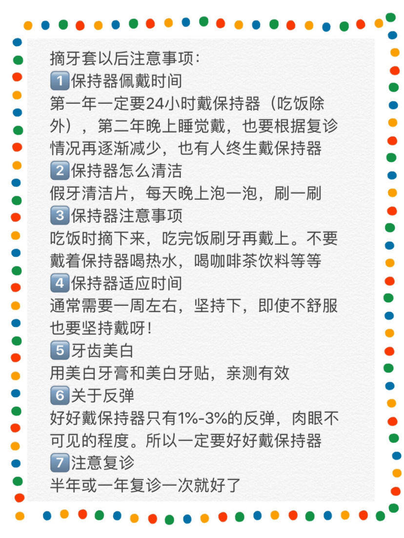 第一年要24小时戴保持器(吃饭除外)🙅♀️,第二年晚上睡觉戴,根据复诊情况逐渐减少🍃,也有人终生戴保持器。总之,为了不反弹变回龅牙妹,我决定一直戴了‼️‼️