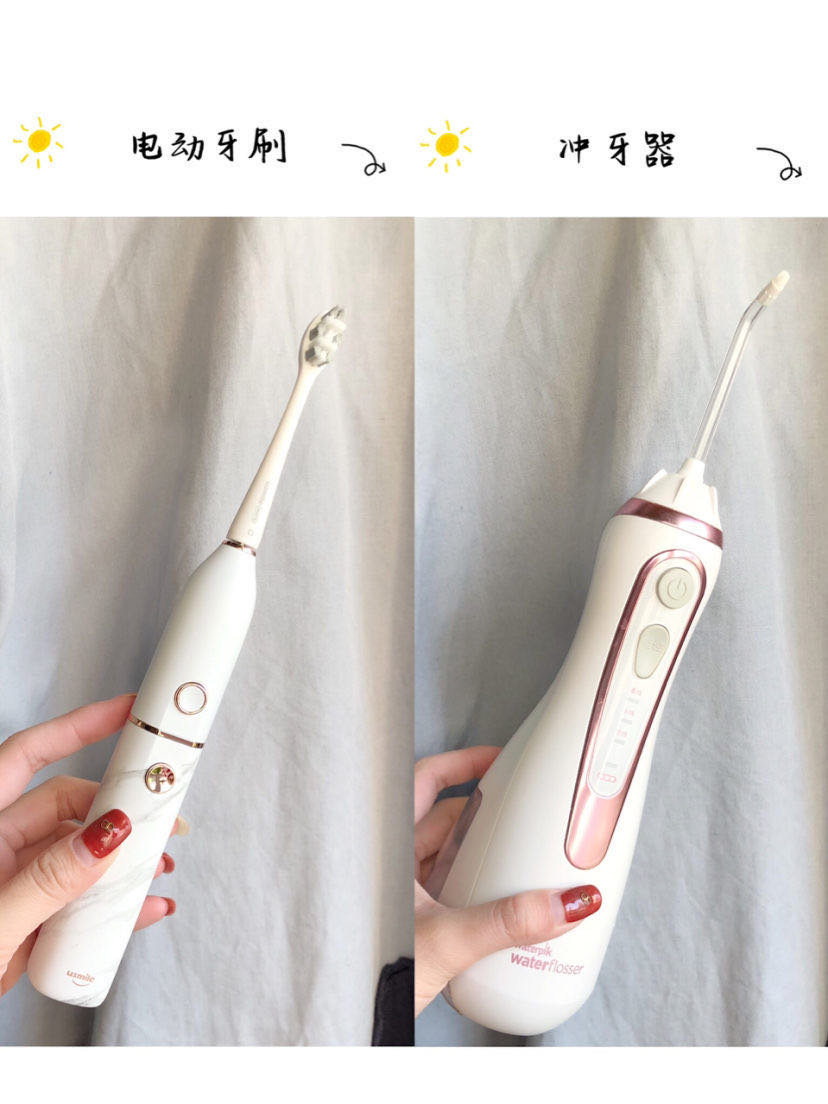 👉🏻冲牙器➕电.动.牙刷:双子电.动.牙刷即使在牙套期间也可以用,用呵护刷和按摩模式,拆了牙套随便用哈哈哈。最近出了大理石款,当然要拥有呀,手感好好。新增了舌苔刷(总共搭配三个刷头棒棒),👅刷干净就没口气了☺️。升级版有双按键,4种模式和3个震-感随便调,认真刷牙就能拥有小白牙啦!冲牙器一如既往好用,睡前冲一冲安心睡觉🌙
