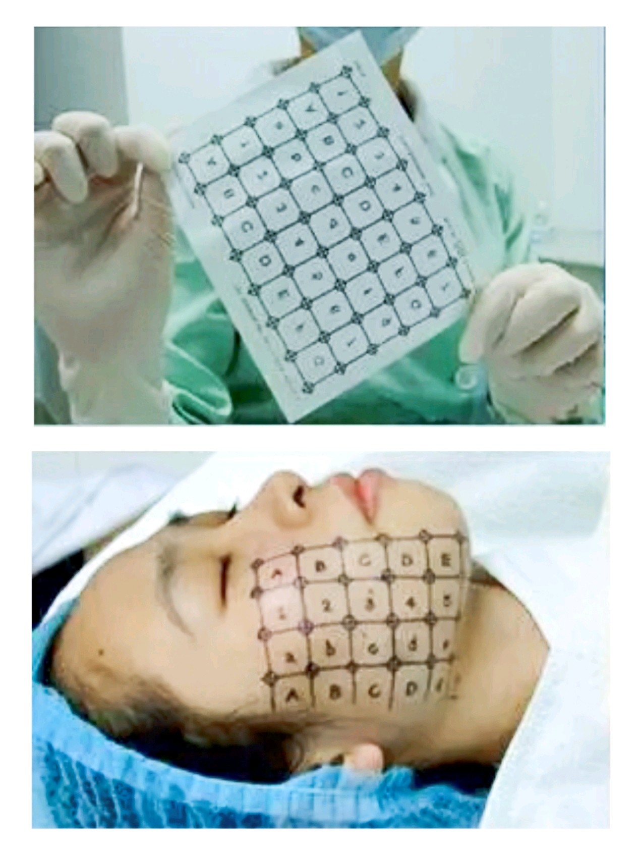 💚③贴上网格贴纸,涂上冷凝胶。热玛吉可以通过打格定位技术,精确地定位治疗的部位,效果精准,对称自然。打完格子后,再涂上隔热的冷凝胶。