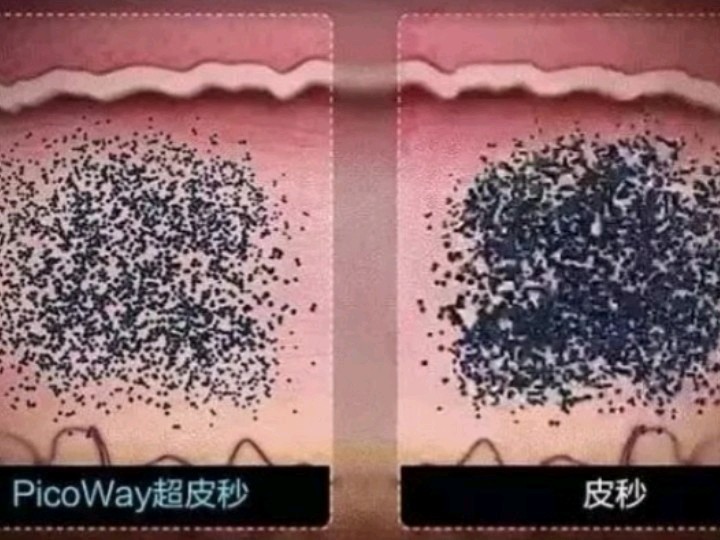 皮秒和超皮秒的作用原理,都是通过聚焦能量破碎细化掉黑色素颗粒,再通过人体自身消化掉。通俗来说如果说皮秒能将黑色素击碎成细沙状,那么超皮秒是能将黑色素粉碎成更小的“粉尘状”。但是皮秒存在一定的皮损可能性,而超皮秒极少造成皮损。