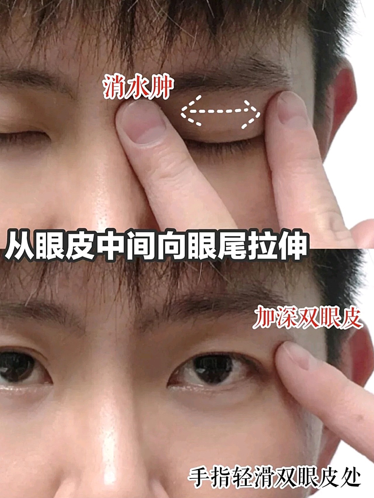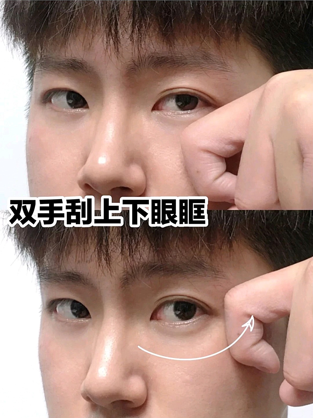 食指中指并拢在眼皮上平行摆动5剪刀手从眼头向太阳穴提拉曲