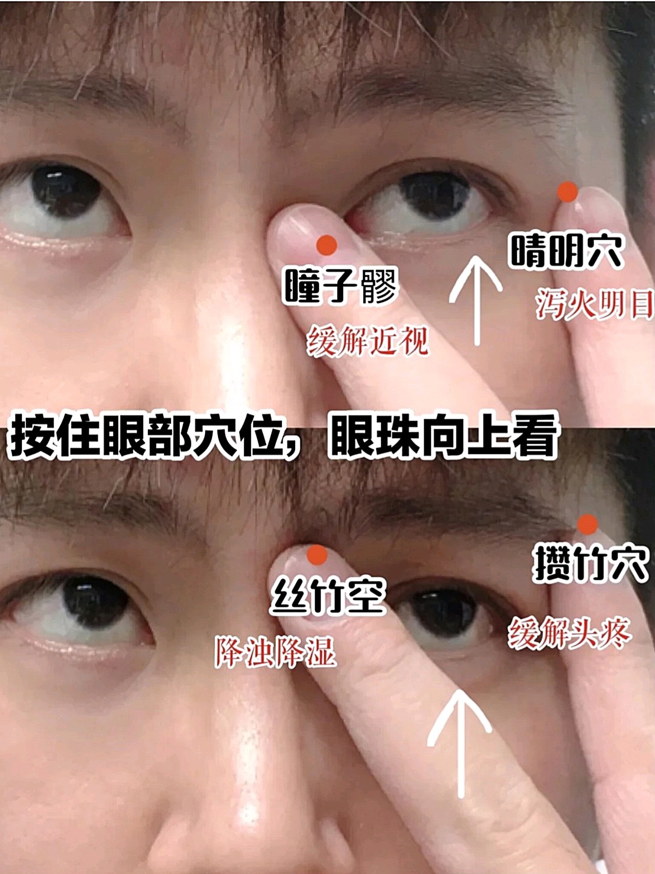 今天就给大家分享- -下我的眼部护理技巧按住眼部穴位,眼珠向.上看山