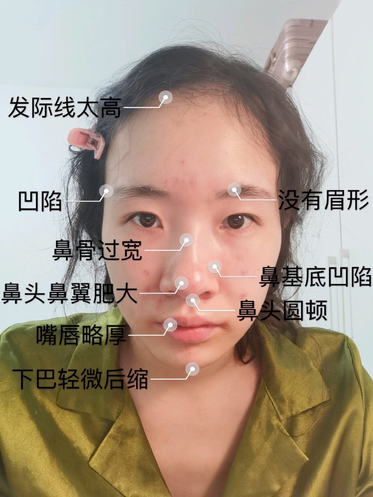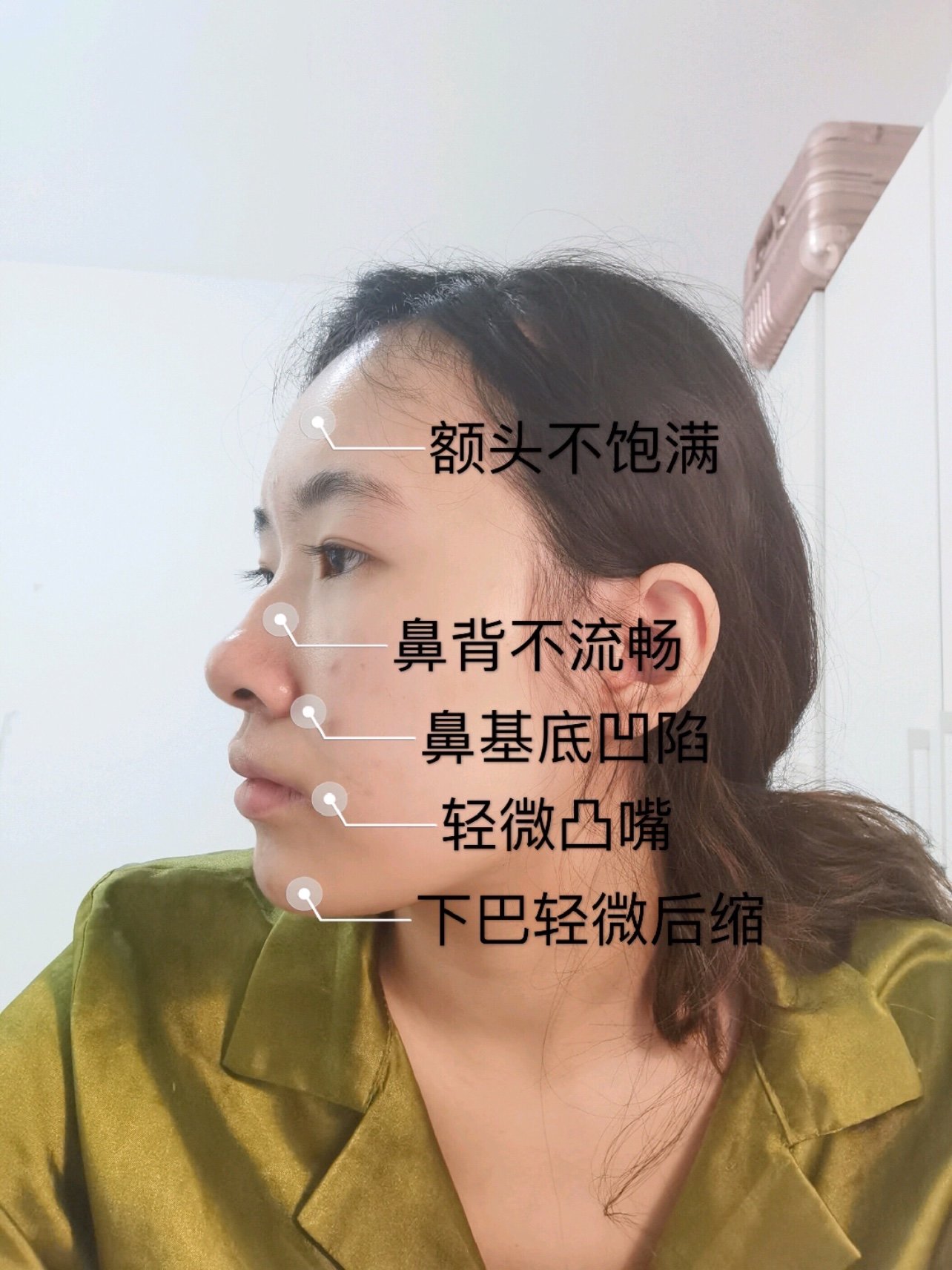 🌟额头不够饱满,鼻梁高度够但是太宽,且鼻背高度不流畅,鼻基底凹陷,轻微凸嘴,下巴轻微后缩。