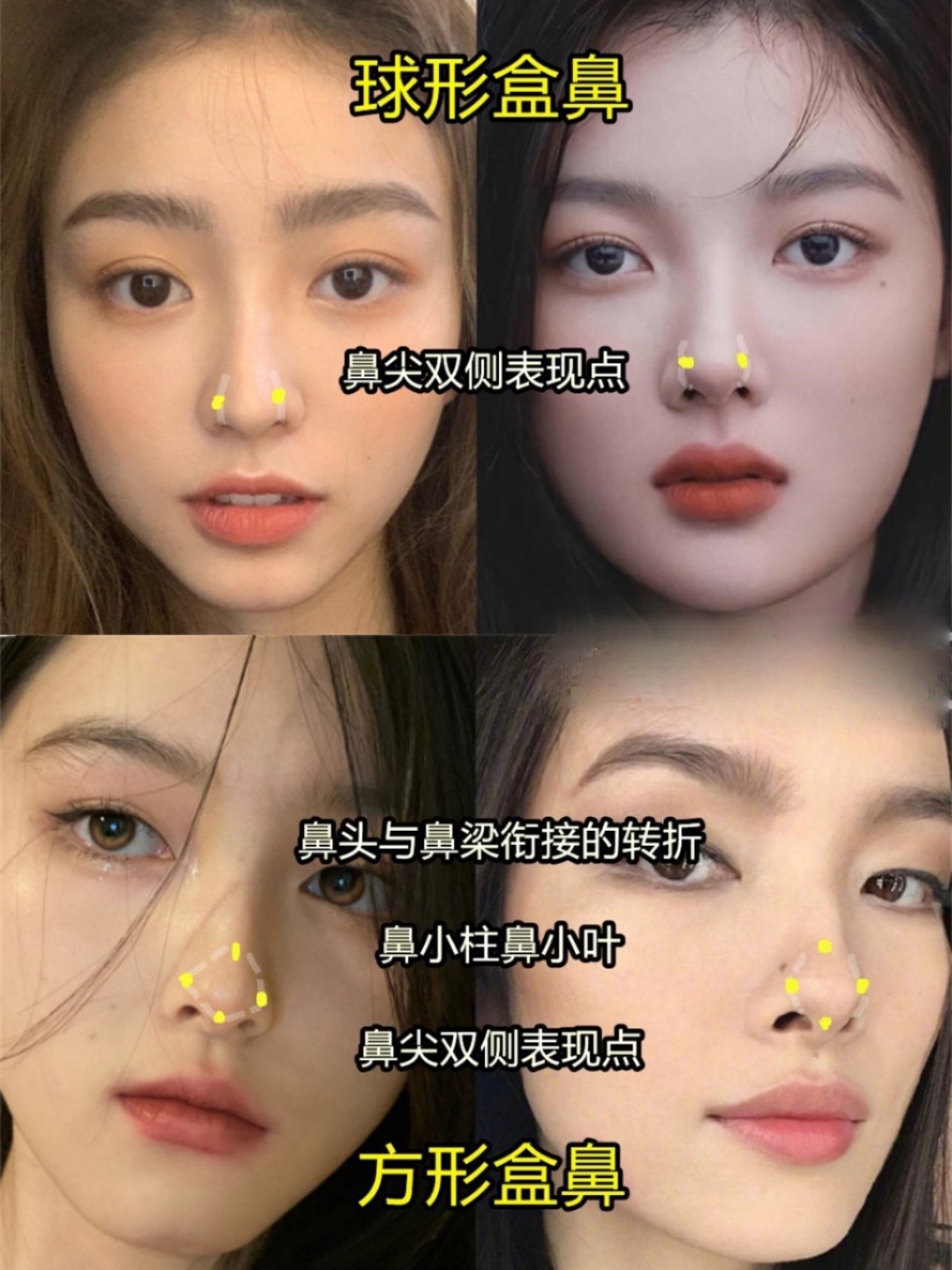 肉鼻头不适合方形盒鼻,对鼻翼软骨和鼻中隔软骨发育良好的人才可以支撑,强行做成方形盒鼻会导致年抛!肉鼻头适合球形盒鼻,鼻头和鼻翼边界清晰,有双侧表现点足够。