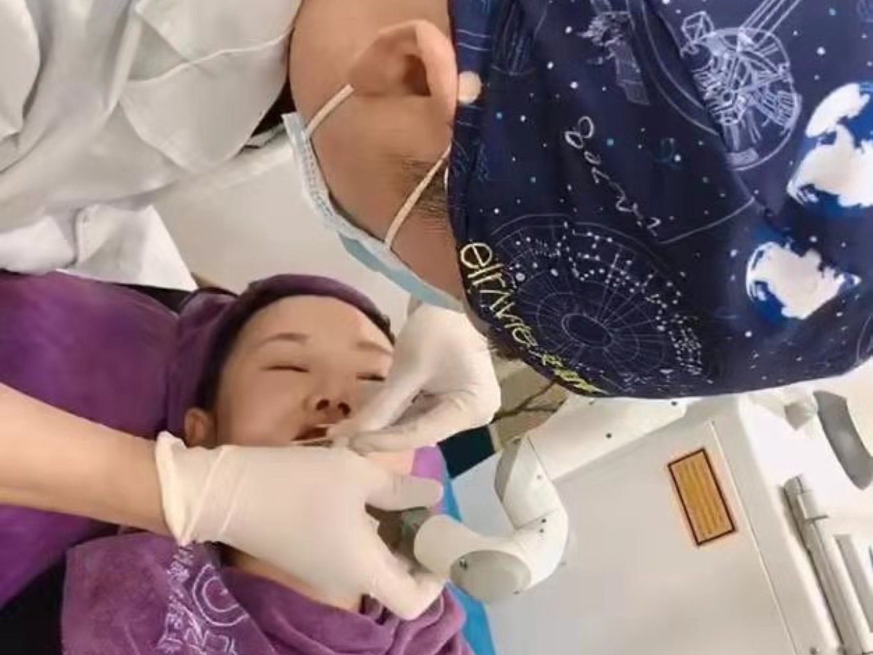 第一步做的是黏膜层从口腔内直接对黏膜层进行激光加热收紧这个步骤对改善法令纹、口角细纹效果比较好。刚开始的时候没有什么感觉,后面能量累积了就有短暂的灼热感,如果针对某个位置特别加强治疗激光能量连着作用的时候就会有一点痛感。