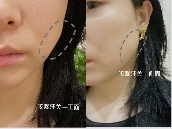 用手摸牙关靠近脸颊两侧是否有明显的硬块肌肉同时在镜子里观察咬牙时是否能看到肌肉突出的情况。