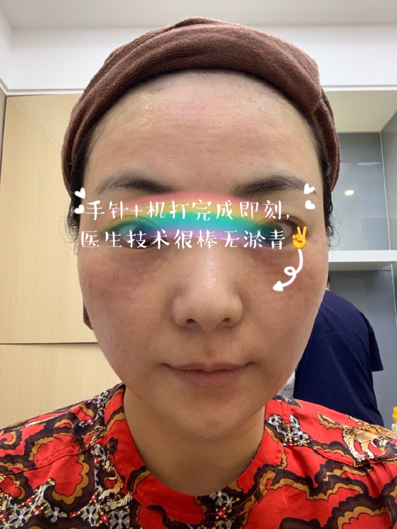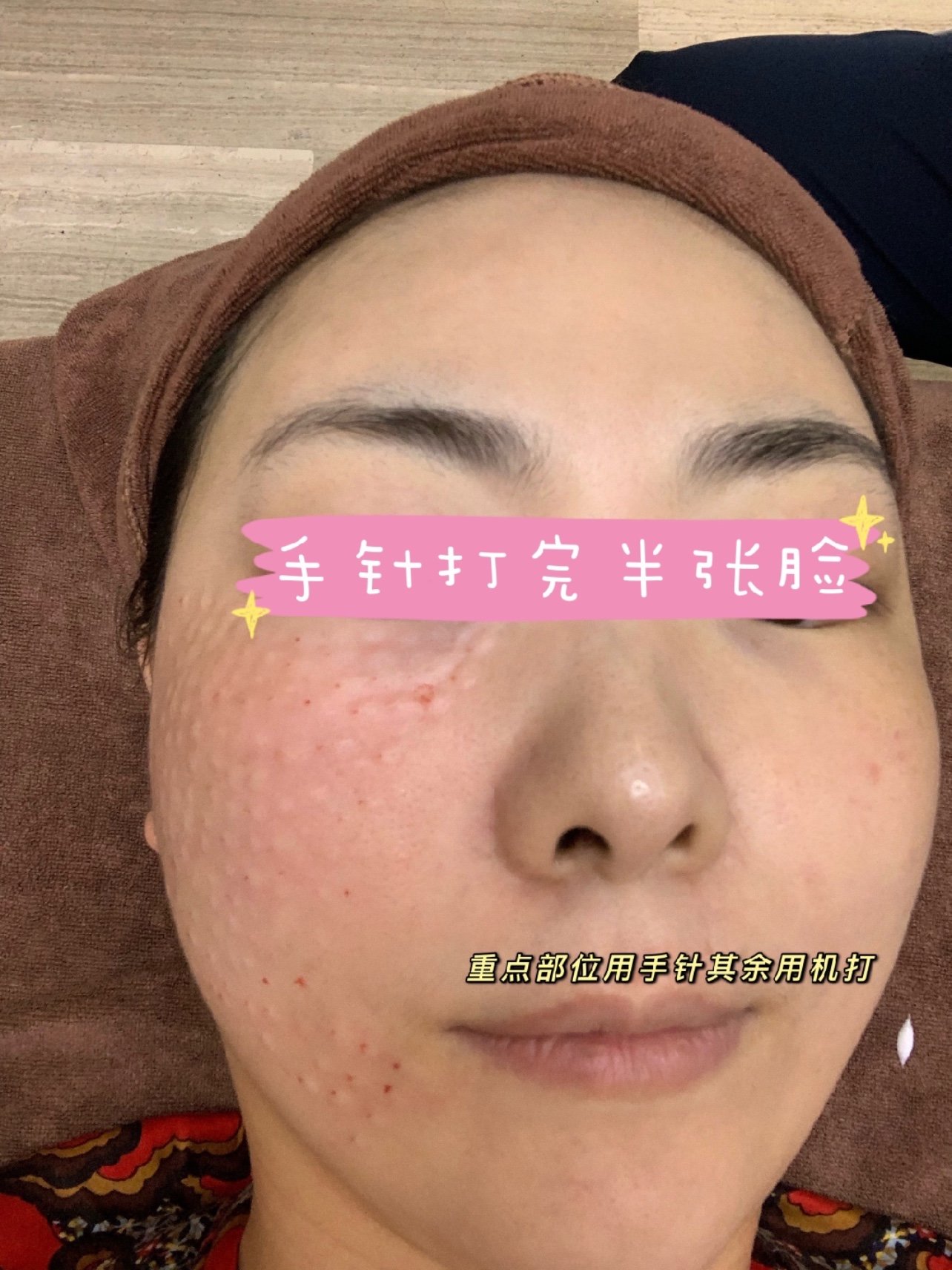4️⃣接下来的机打就是轻松愉快了,没有痛感,很快就做完了。打完后面部有些红,鼻子周围有零星针眼,能看到一些皮丘隆起,没有淤青非常满意!