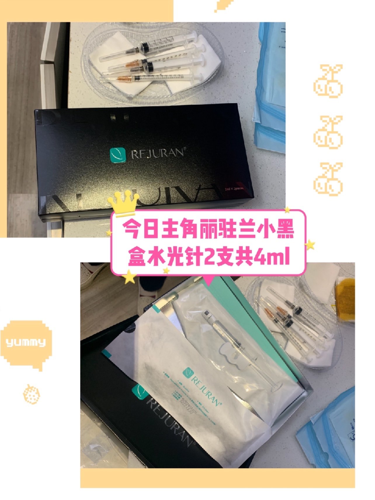 3️⃣ 洗完脸麻药敷了半个小时,然后就要进行紧张的水光注射了。💪💪护士姐姐拿来了丽驻兰小黑盒,一盒里面是两支针剂,每只2ml,一共4ml。注射的医生很温柔,准备先手针注射重点部位,然后再全脸用水光机打一遍。医生姐姐手法很轻很细致,从眼周开始注射的,眼周几乎没感觉到疼痛,脸颊颧骨有些痛,还有嘴角手针也有些痛。