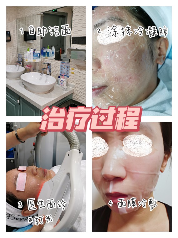 洁面→皮肤检测及面诊→涂抹冷凝胶及眼部遮光→全脸打光&局部加强(约10分钟)→面膜冷敷