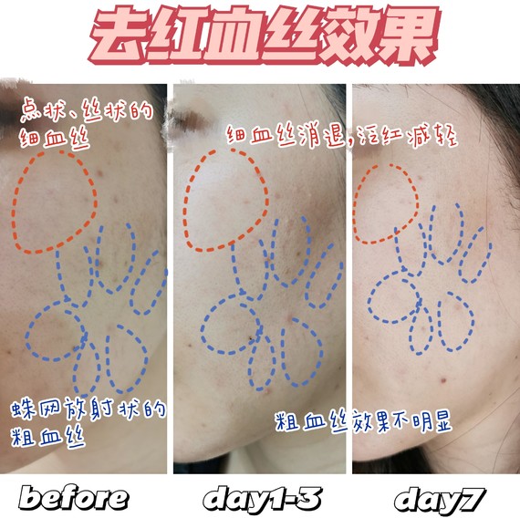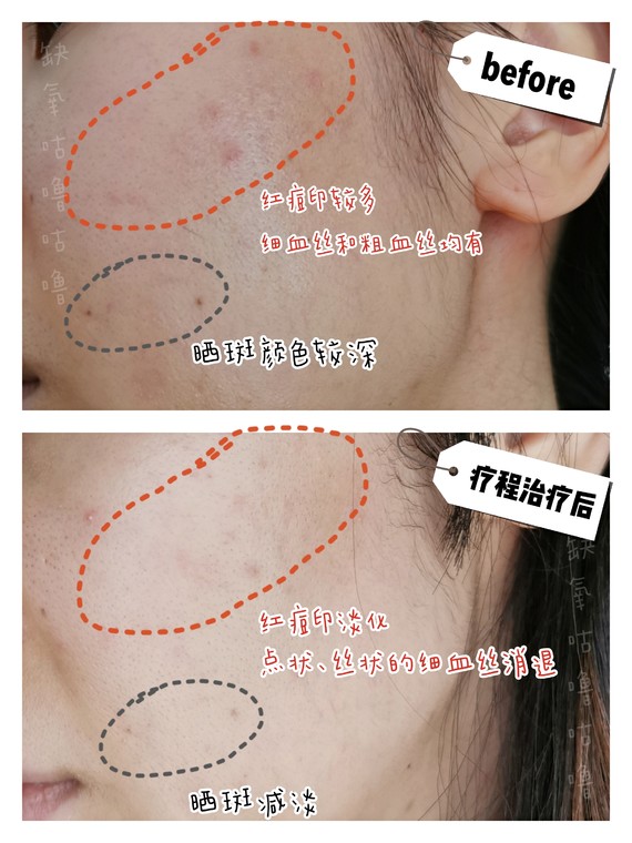 ❤ 以本人肤质为例:我是混油敏感皮,脸上皮肤炎症、红血丝区域较多,爱起闭口,所以红色痘印也不少,另外局部有晒斑。因此【治疗需求】就是褪红血丝、去痘印和晒斑。