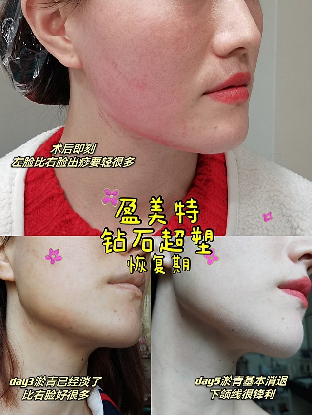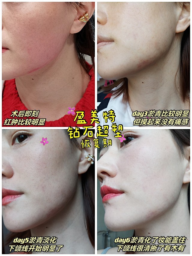 🔺术后第五天:脸上的淤青痕迹基本完全消除,洗脸的时候可以明显的摸到做过后的下颌线像刀锋一样的锋利(效果超赞)