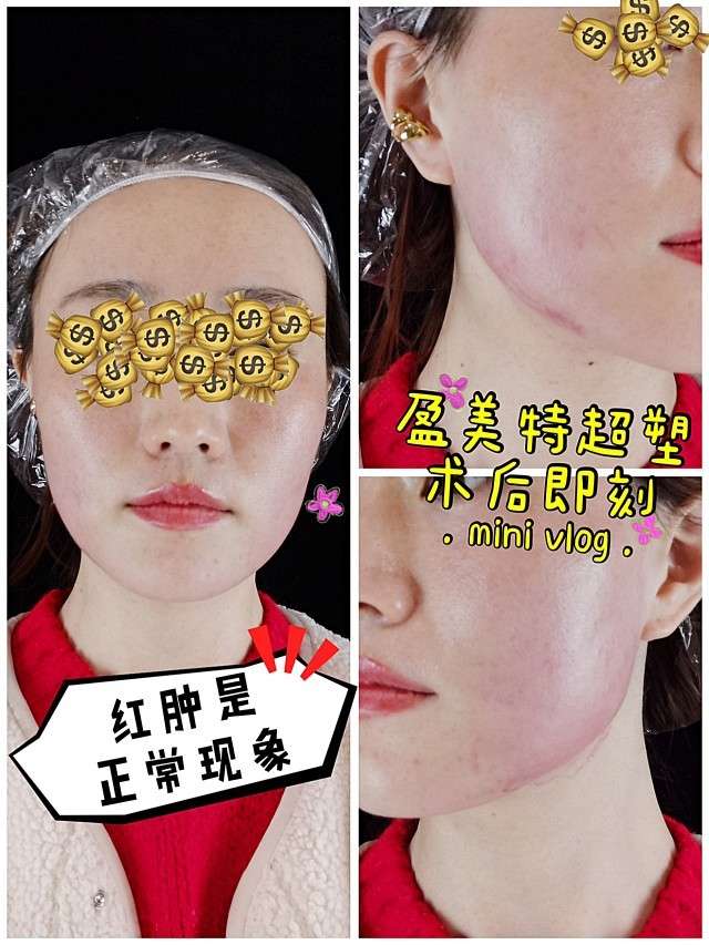 🔺术后当天:下颌线有一些明显的红肿和淤青这是正常现象因为它是有负压吸起来的,说所以会引起红肿出痧…