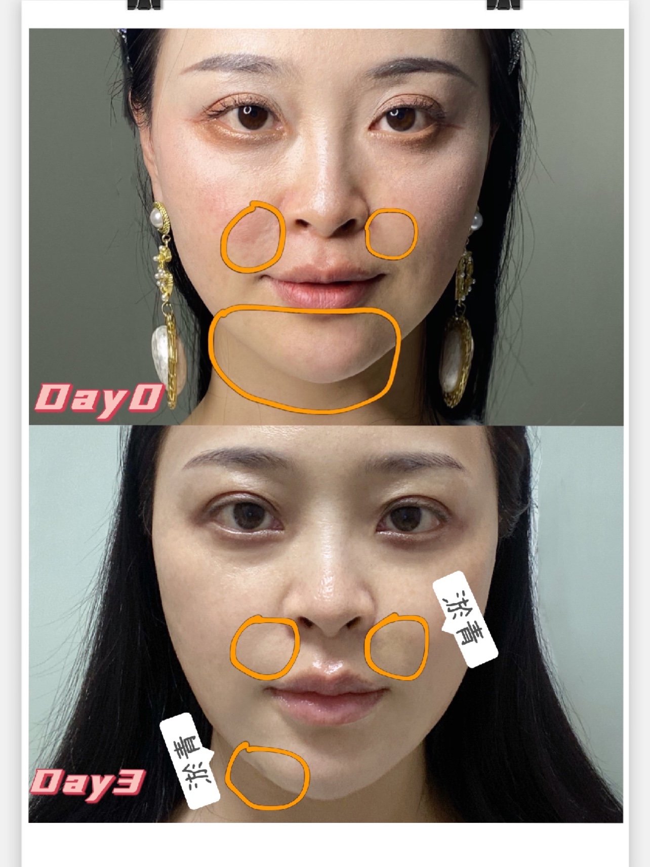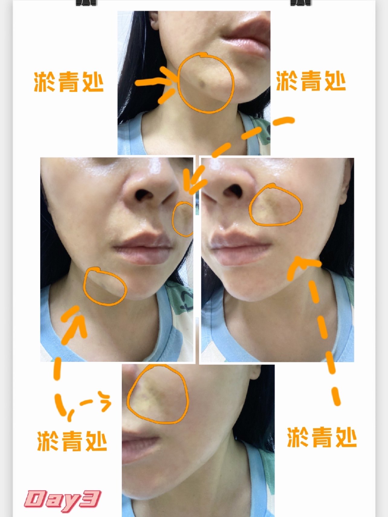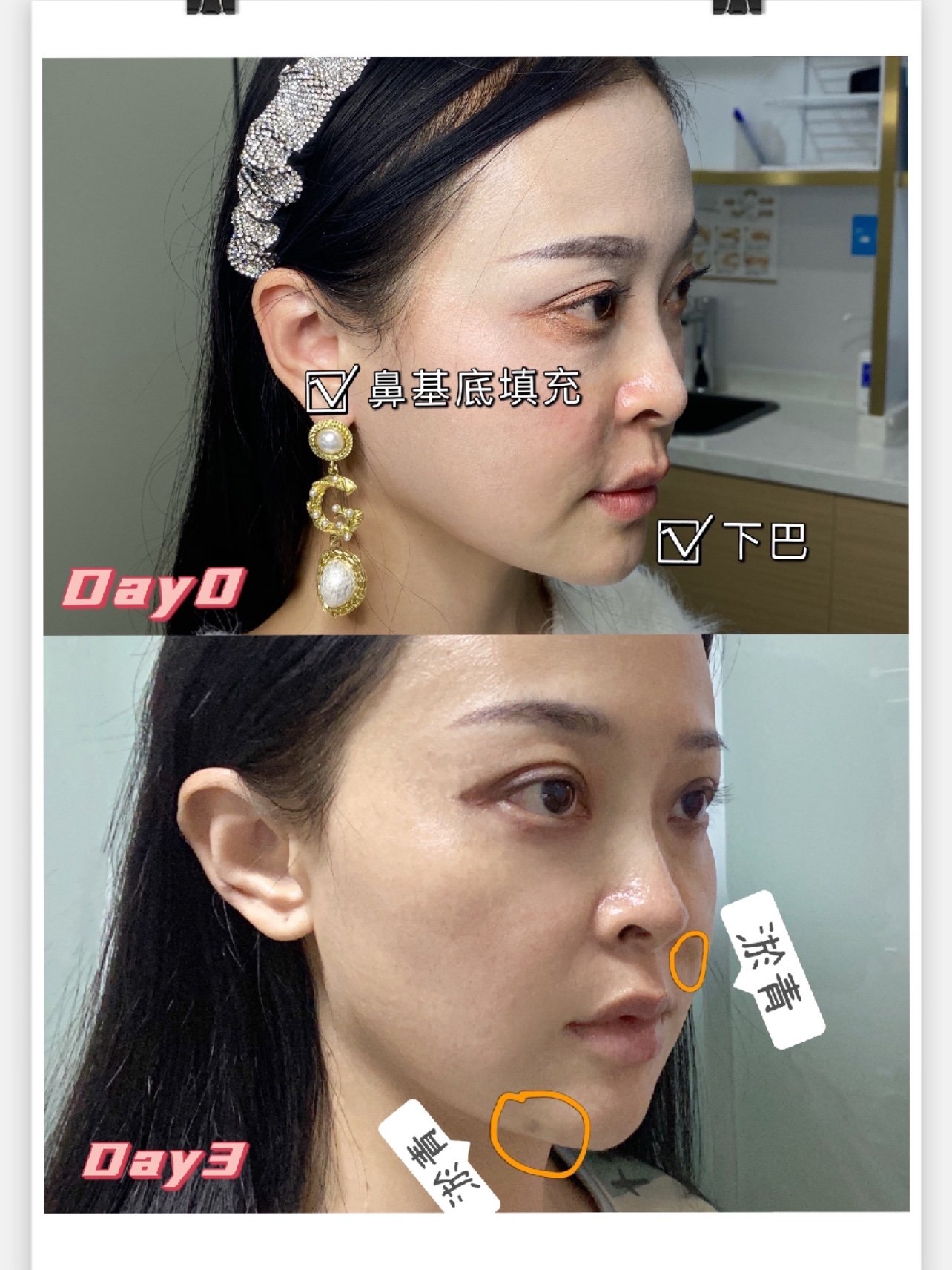 🌟🈶️一个问题,不知其他的体验官有没有出现?我有两处比较明显的淤青,一处是右侧鼻基底处,该处淤青面积还有点大。另一处是在左侧下巴衔接处,淤青呈圆点状。这两处都是进针点,可能与此相关,希望随着后面恢复,能逐渐消退。