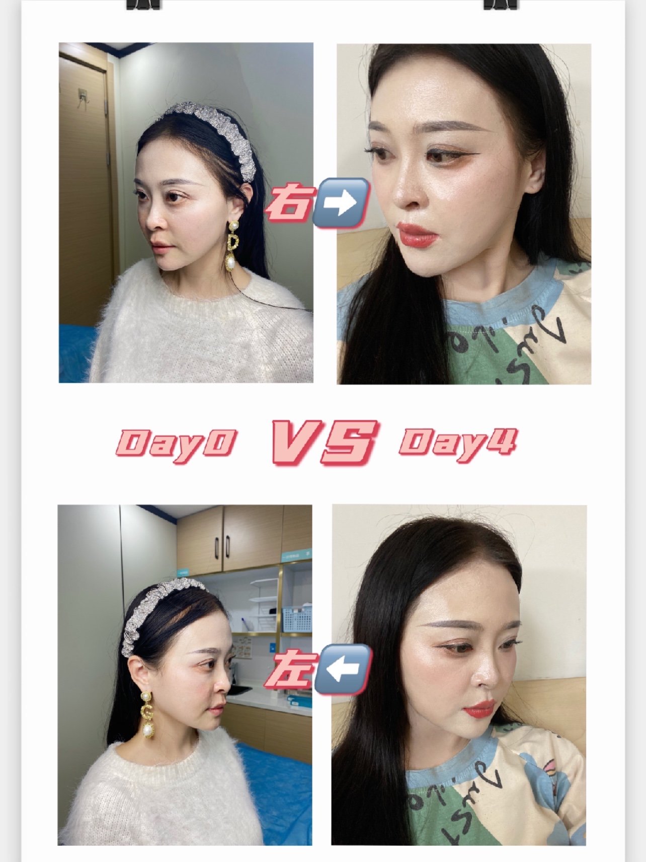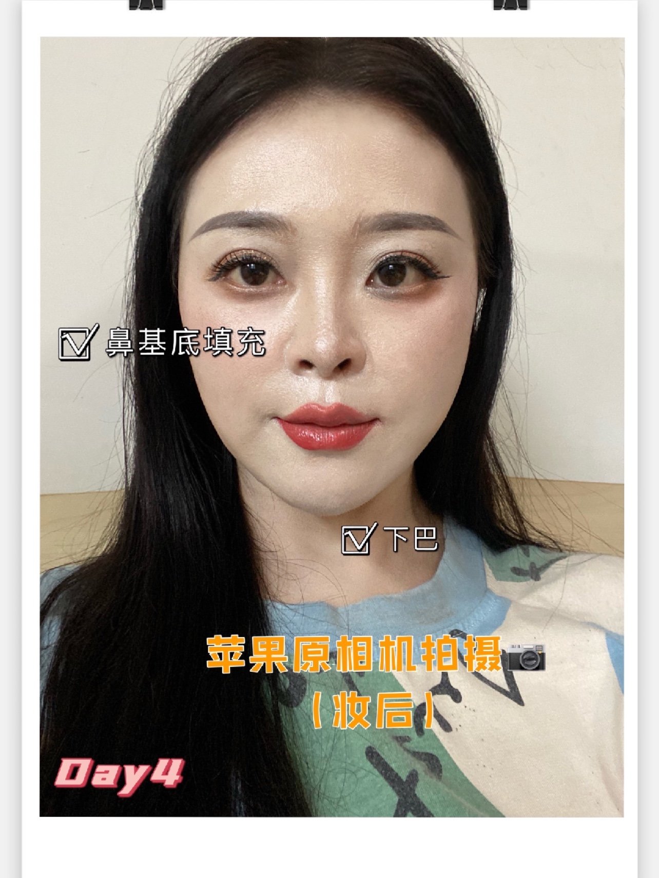 第四天,基本就已经正常恢复化妆了。整体妆后对比,可以看到鼻基底处相比之前确实是填充饱满圆润的效果,现在的状态整个中面部是嘭起来的。下巴处的比例看上去也比原来更协调了,想改变三庭比例的宝宝真的可以尝试。