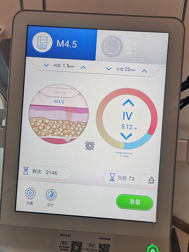 听说4.5刀头可直达SMAS筋膜层,可提拉紧致我脸部两侧法令纹、提升苹果肌;2.0炮头可达真皮层,刺激胶原再生,淡化全脸皱纹。