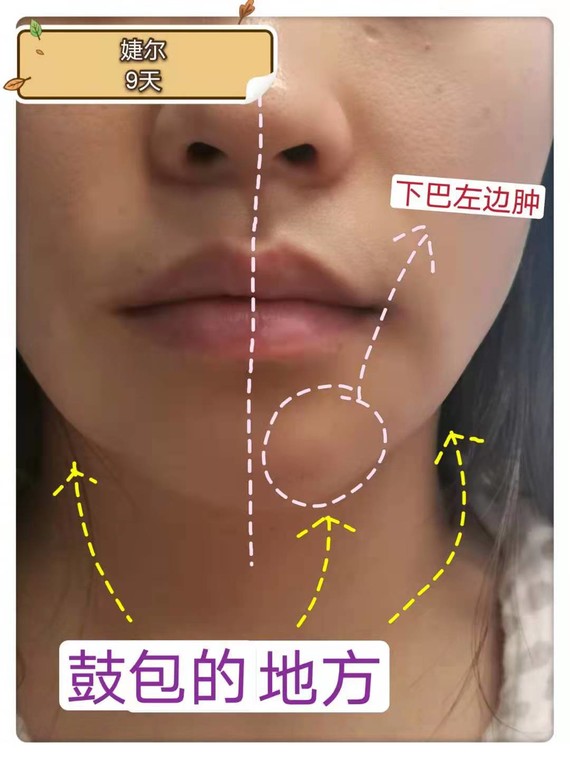 针对这种情况,问了医院,院方一直回复等待一段时间,再观察观察。迫于实在影响容貌,我在去另一家医院时,打了溶解酶。(现在想想,应该直接找美莱医院去解决,当时的心理状态是完全对美莱死心了,不相信这个医院的技术,所以在其他医院打了溶解酶)。