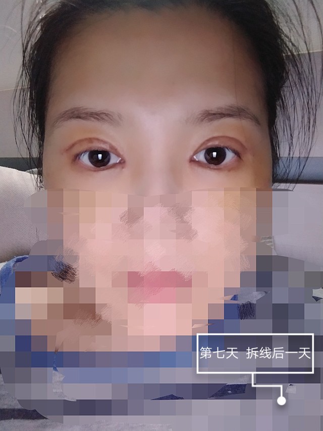 第五天,四楼取号去拆线,这个有点疼,眼睛上留了一点印儿。特意问了医生,眼周的黄色啥时候褪去,医生还得一周。