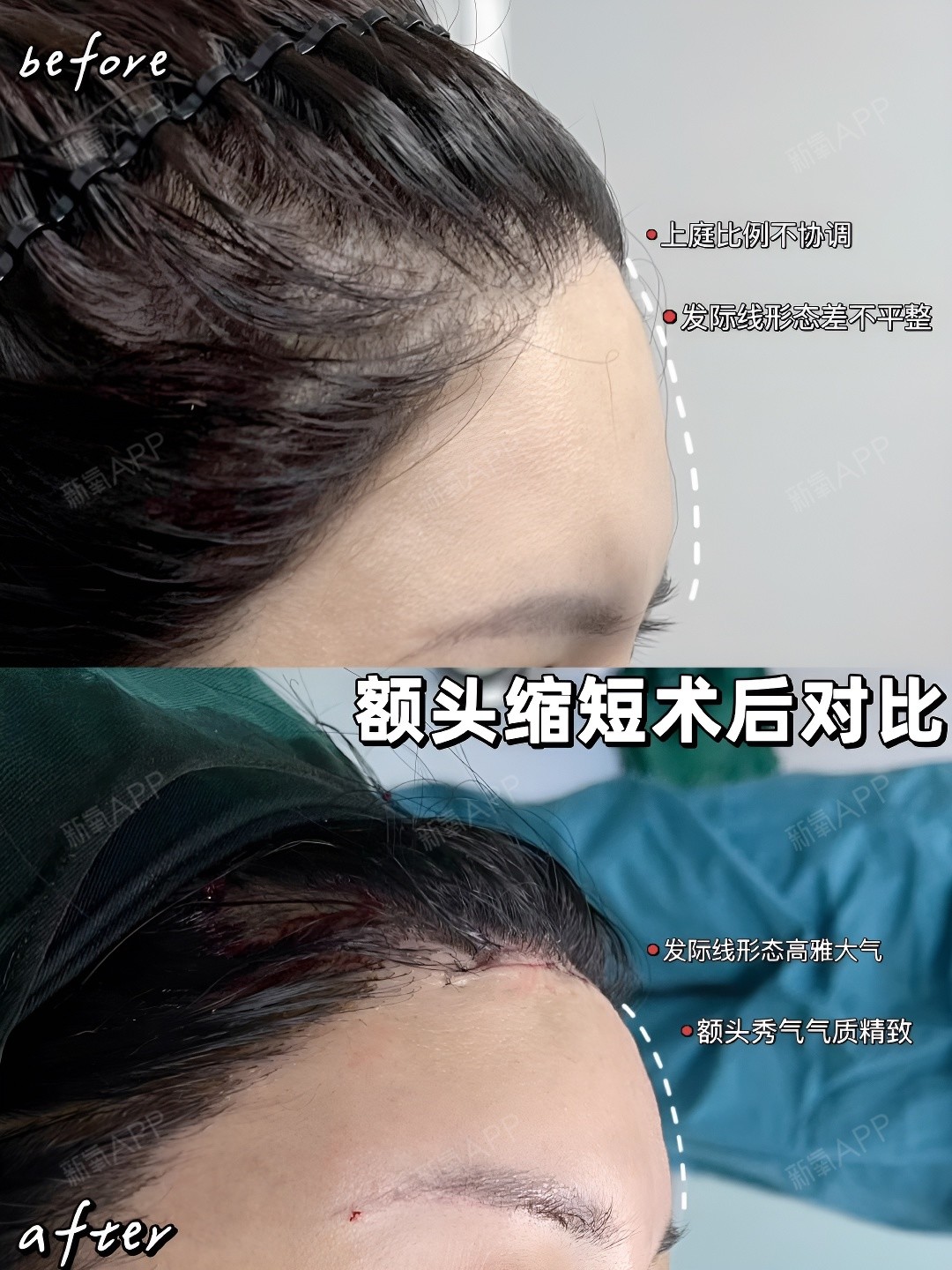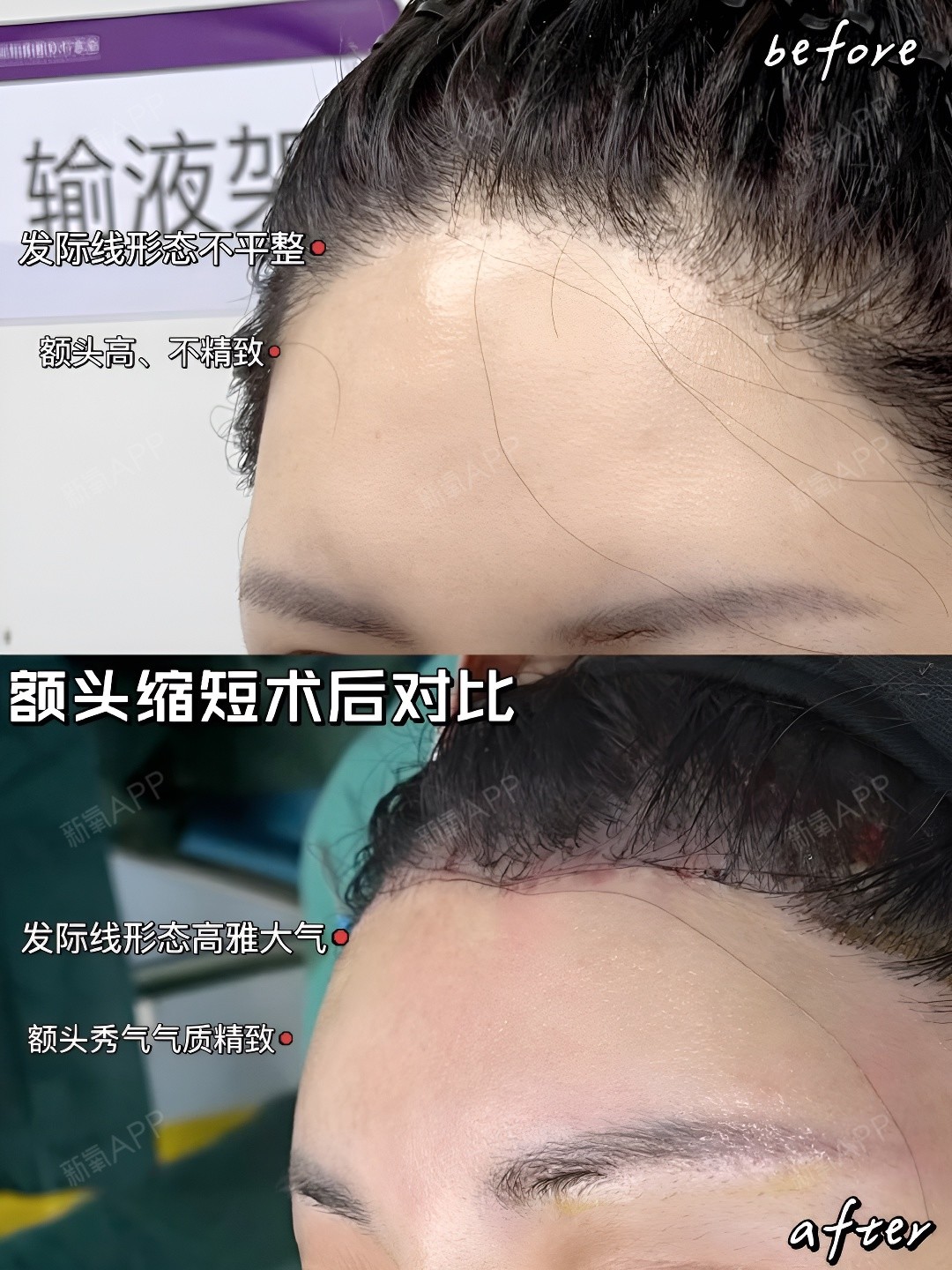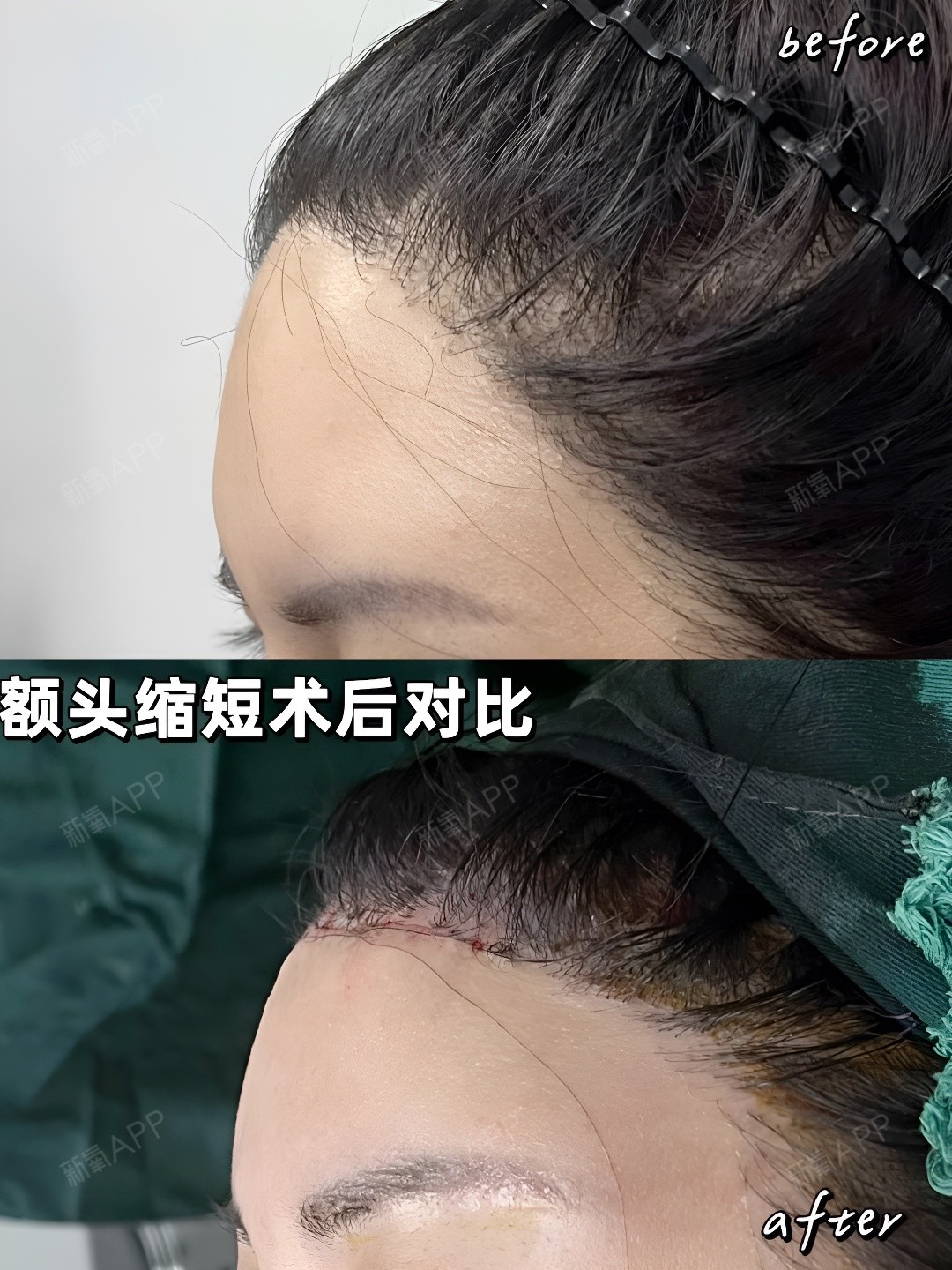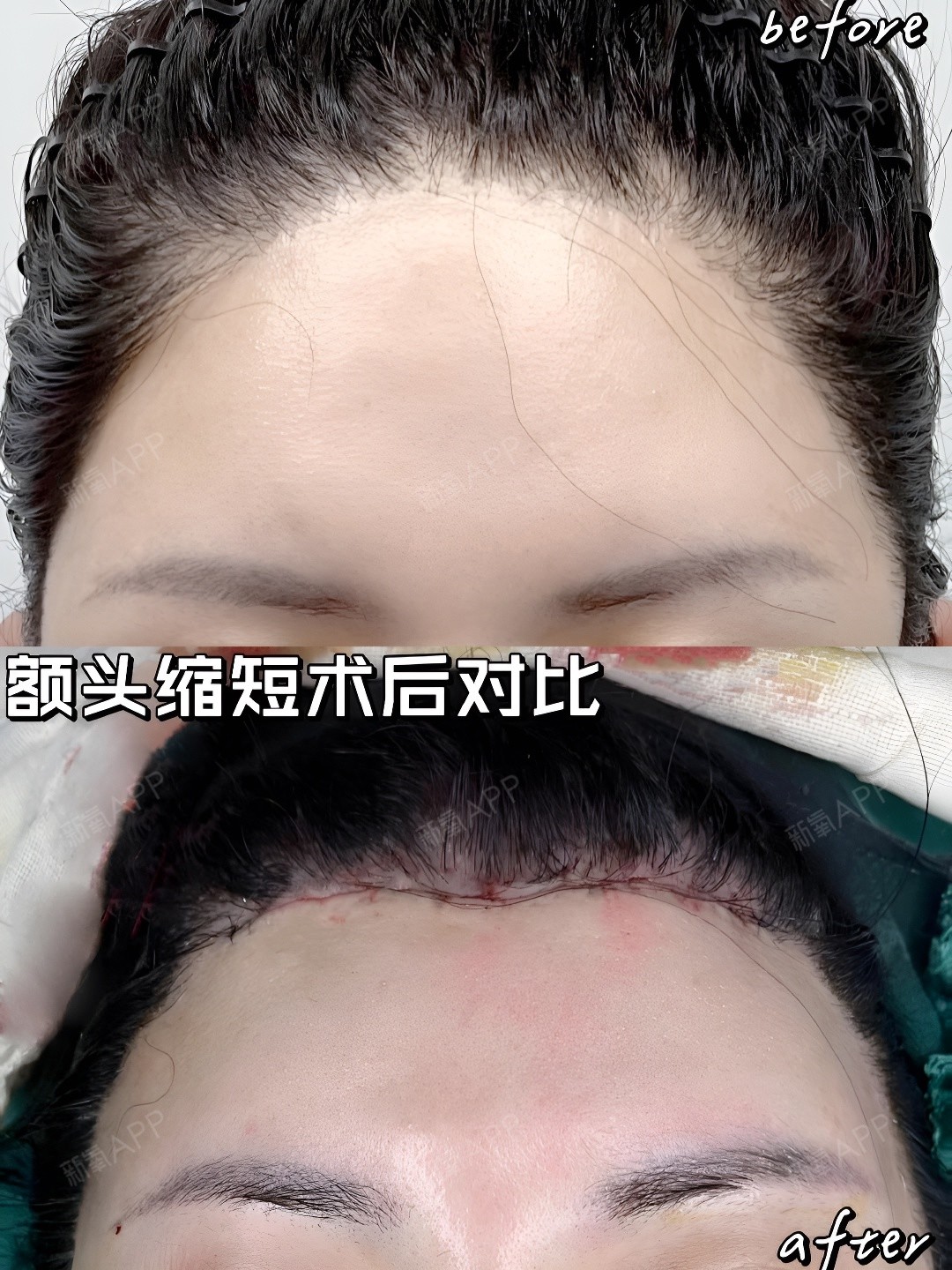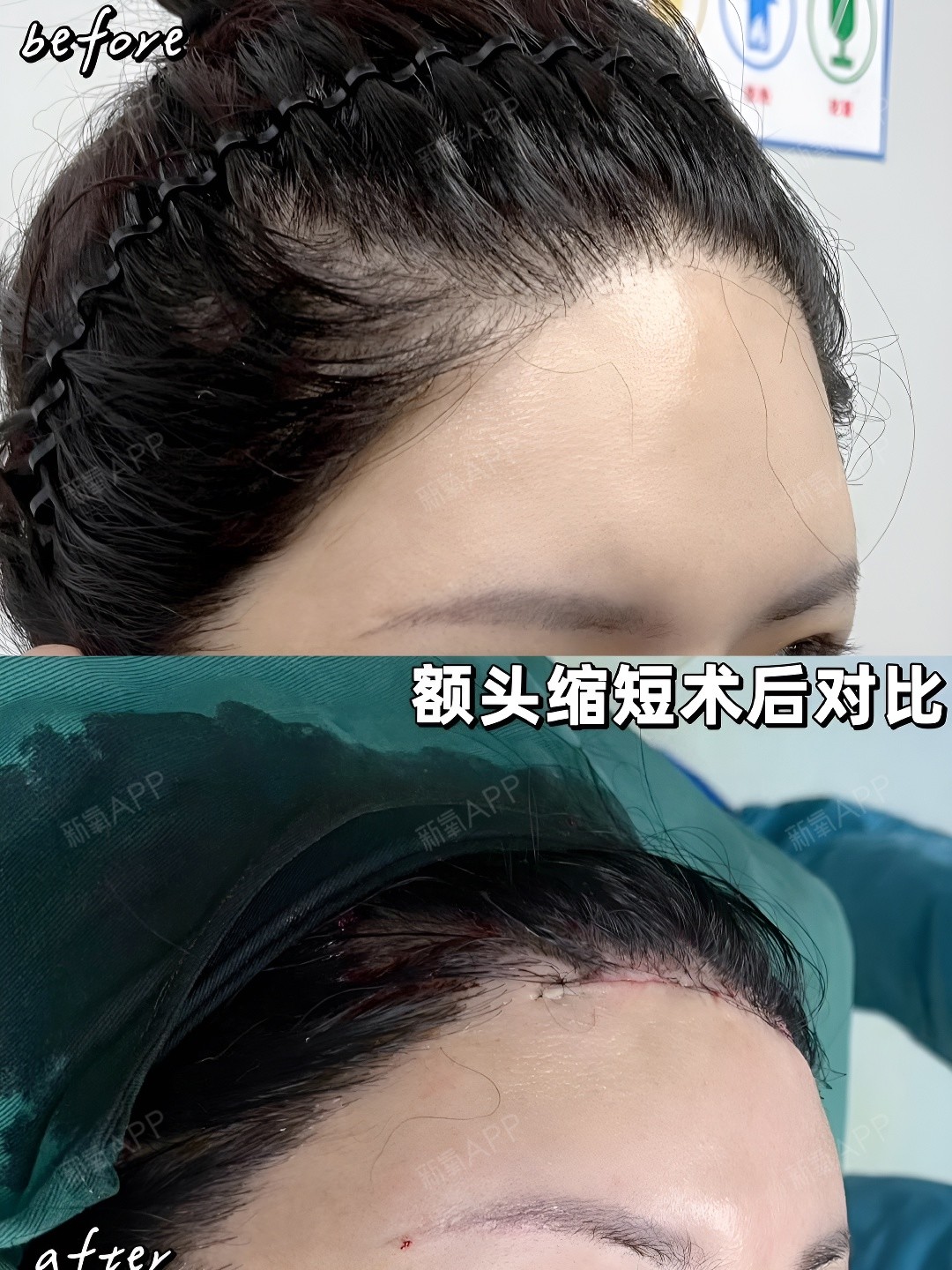 做完植发有很长一段时间了,两边鬓角去毛发生长还可以,就是额部中间那一块区域就是不长,视觉看像中间缺了一块,看起来特别突兀。脸型也衬托的不好看。而且哪里头发种植痕迹特别明显,特别假像带了个假头套一样。主要来做额头缩短呢。想着把那一块区域去除设计一个好看的发际线形态。还有就是提升下眉间距改善眉眼耷拉。