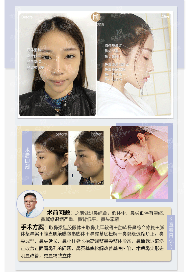 2.鼻综合手术:包括隆鼻、鼻小柱延长、鼻翼手术等