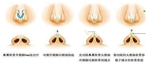 鼻中隔软骨是两个鼻道中起分割作用的板状软骨,将其前方与上方各保留一部分,后下方整体取下时,既可以维持鼻形态的完整,又能得到所需材料,而且取材部位又与鼻整形处于同一切口,不用另外开刀。鼻中隔很好加长或是抬高鼻小柱,固定在鼻中隔前方后可让鼻尖向前向下,能很好地解决“朝天鼻”和“露鼻孔”问题。